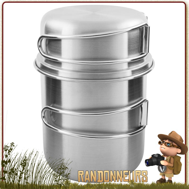 SET POPOTE BIVOUAC INOX BIWAK 1 RELAGS - Ensemble complet de Popote Acier Inox Biwak 1 Relags pour la randonnée et le camping, pour 1 à 2 personnes. Set Popote Inox avec deux casseroles, couvercle poêle, pince preneuse. Robuste et compacte, popote inox idéale pour votre sac dos rando bushcraft nature